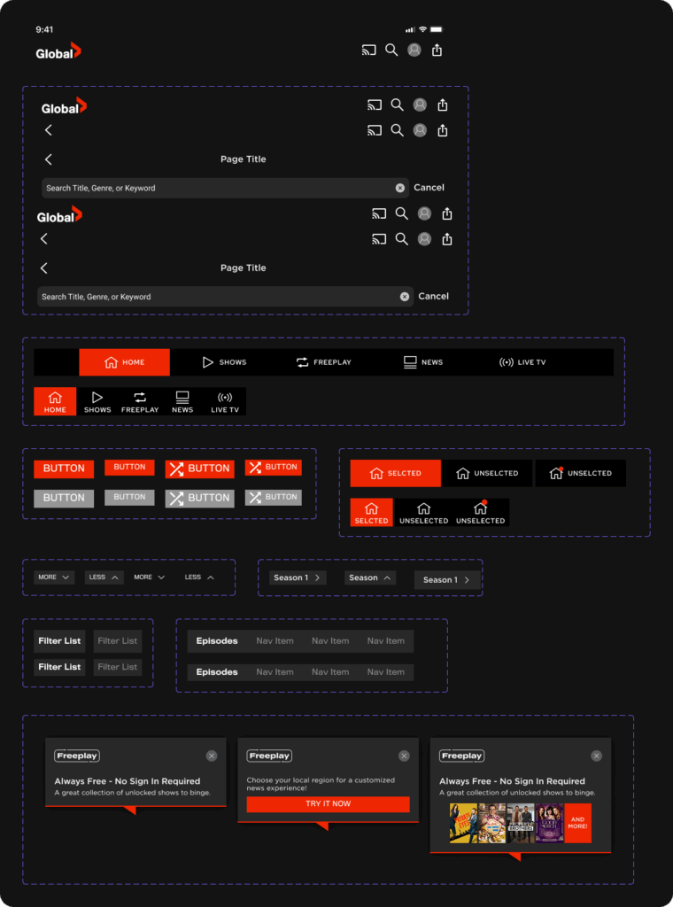 As the Senior Product Designer responsible for the Global TV app across web, iOS, Android, and tvOS, I led the transition of our existing component set into a structured, reusable system in Figma. While the core components already existed, I reorganized and rebuilt them as a usable library.