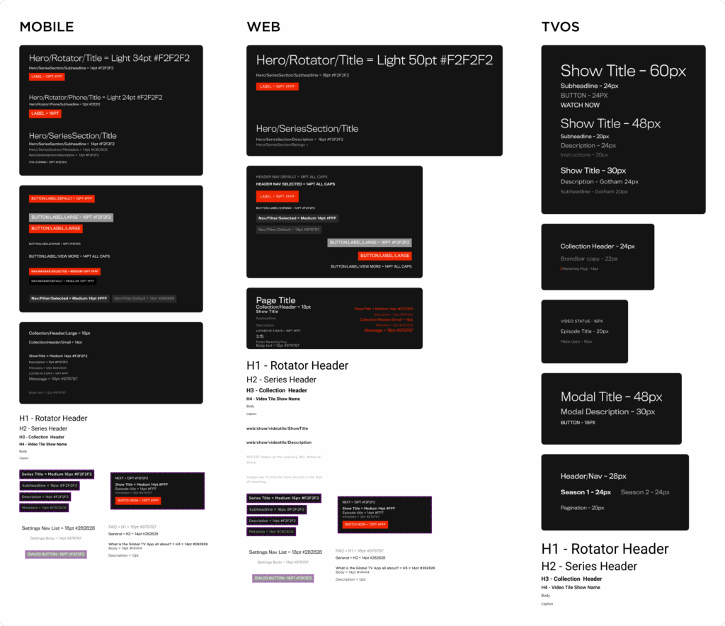 When I joined the team, the Global TV product already had a functional UI across web, mobile, and TV. However, with the company transitioning from Sketch to Figma, I saw an opportunity to create a more efficient and scalable design system that could support multi-platform work in the future.
